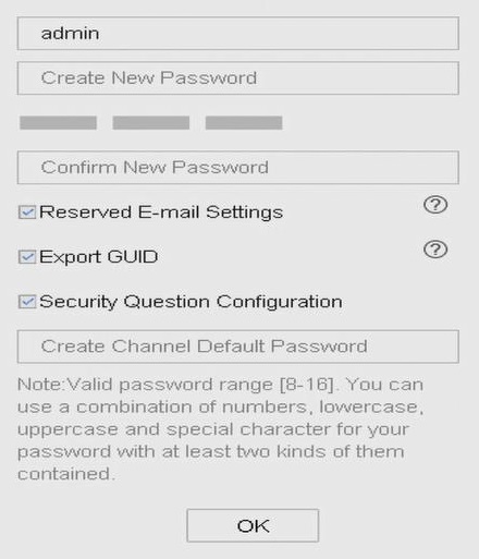 The first thing you will be prompted to do is set a password. You need to create a password, confirm it in the second box and enter the same password in the IP Camera Activation box. We recommend leaving the Security Question box ticked as this will allow you to create answers to three security questions which will enable you to reset your password if you forget it in the future.