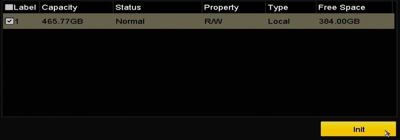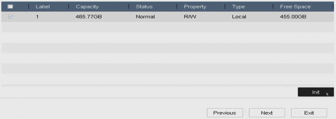 3) If you do not have a Hard Drive installed in your DVR the next page can be skipped. If you have got a Hard Drive installed you will need to select your Hard Drive by ticking the box to the left of the device and then click Init. You will see the Status change to Initialising, wait until the status shows Normal and then press Next.